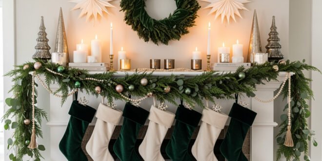 Elegant fireplace mantle with silver ornaments, tall candles, a round mirror, and two knit stockings, creating a modern Cozy Christmas Décor style.