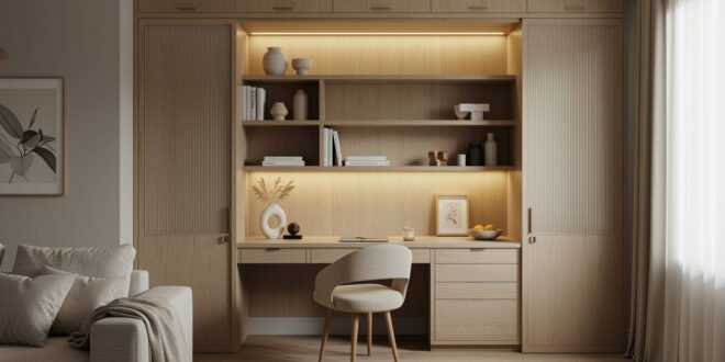 Built-in wood desk with open shelving, soft lighting, and minimalist decor creating a warm and inviting closet office (cloffice) space.